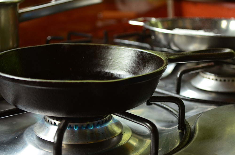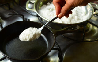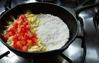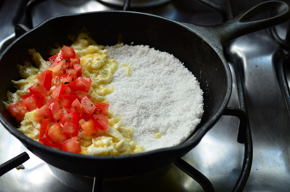 - Coloque de 2 a 3 colheres de sopa de farinha de tapioca na frigideira.
